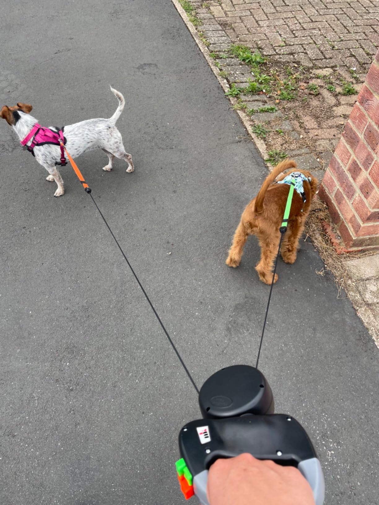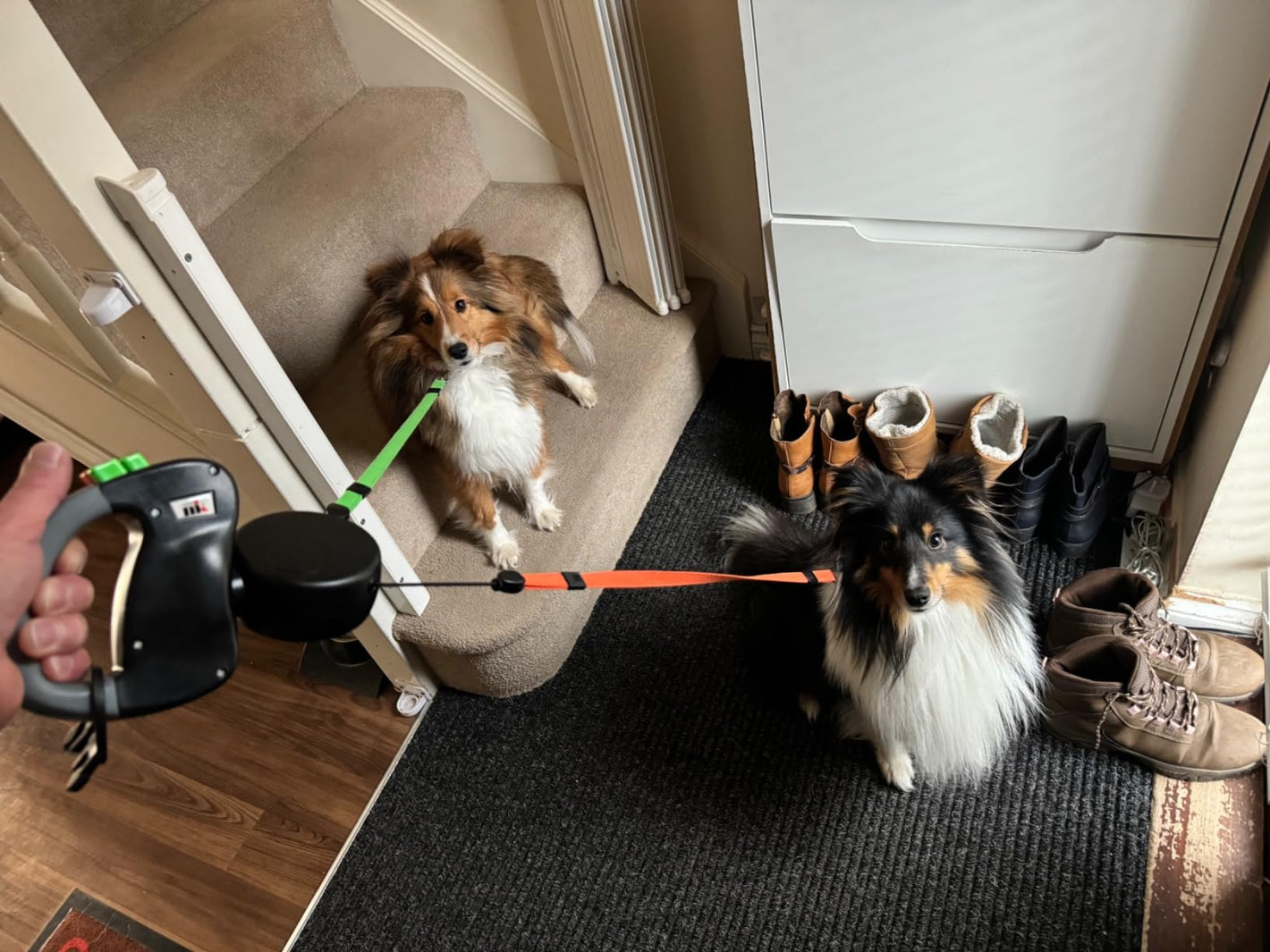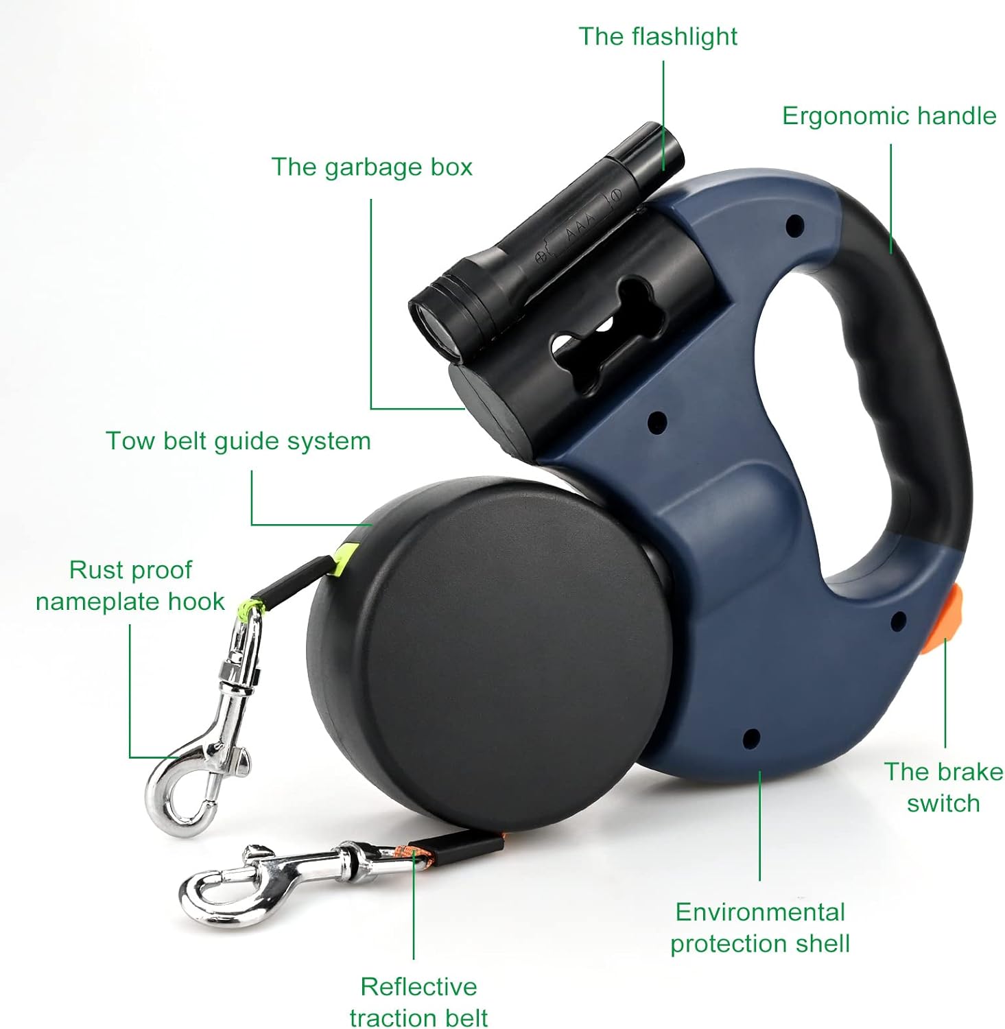 Equipped with a bright LED light and reflective leash for visibility in low light.